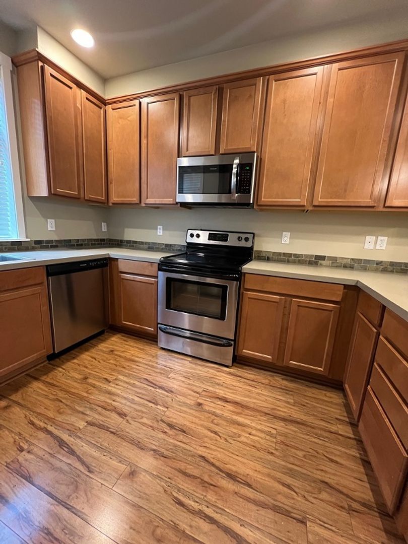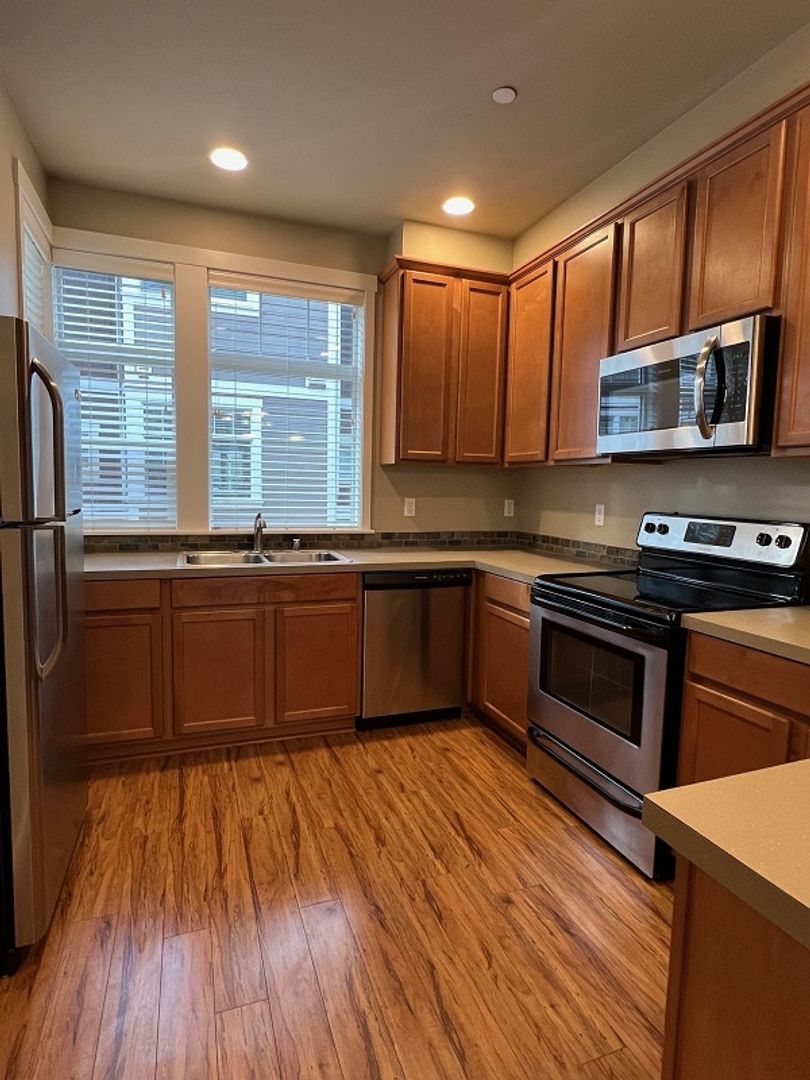 Gorgeous 3 level townhome situated in a park-like setting. Amenities include a fully equipped upgraded kitchen with premium stainless-steel appliances (refrigerator, stove, dishwasher, and microwave), disposal, pantry, tile back splashes, and taller upper cabinets for extra storage. Air conditioning, high ceilings, energy/efficient/recessed lighting, large closets, and full-sized washer/dryer. Well-designed floor plan with hardwood floors, durable carpeting, vaulted ceilings, designer color schemes, spacious rooms with open living area and plenty of natural light from oversize windows, and a private patio. Attached garage and bonus room.